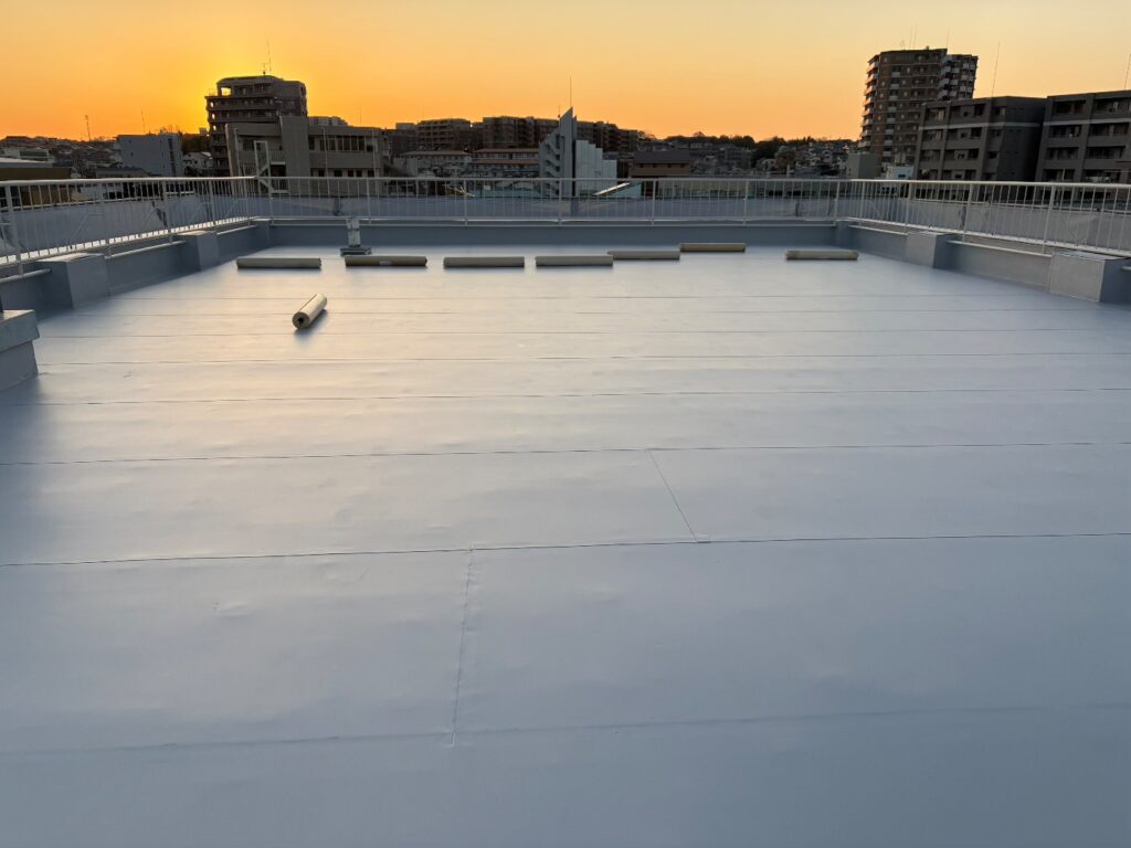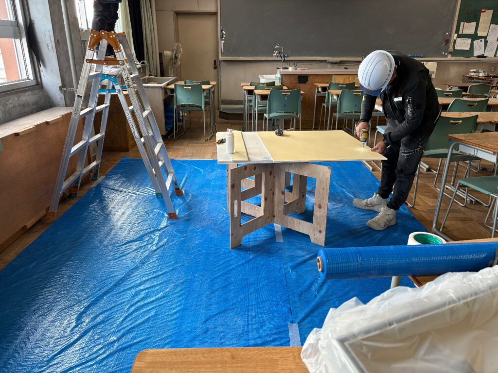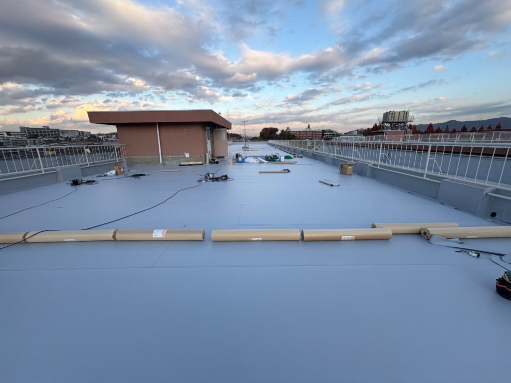 枚方市内〇〇高等学校の現場です。屋上防水防水、渡り廊下改修、教室内装改修工事と多岐にわたる